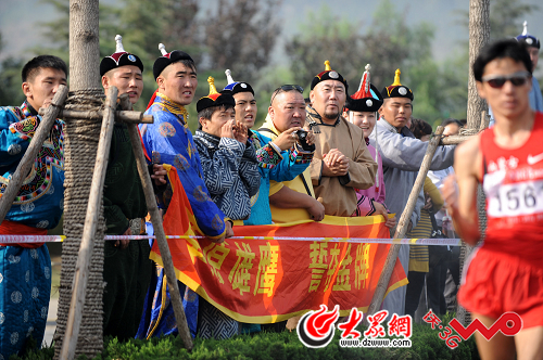 一只身穿民族服裝的啦啦隊在場邊為運動員加油。他們是內蒙一些退役運動員組成的。李勇 攝