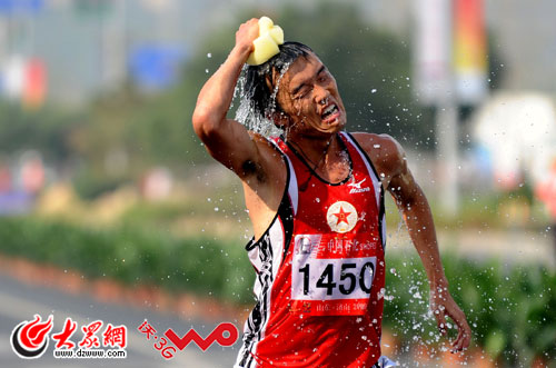 解放軍選手薄向東往頭上灑水降溫。李勇 攝