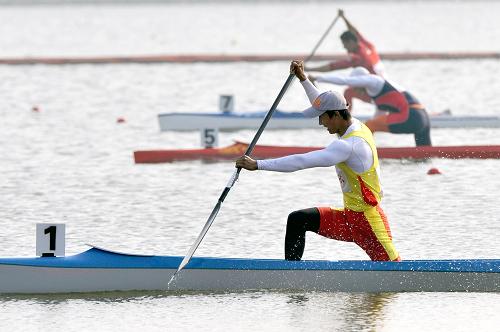 10月26日,山東選手梁福巖(前)在比賽中奮力劃行。當日,在第十一屆全運會男子單人劃艇1000米決賽中,梁福巖以4分02秒497的成績奪冠。 新華社記者朱崢攝