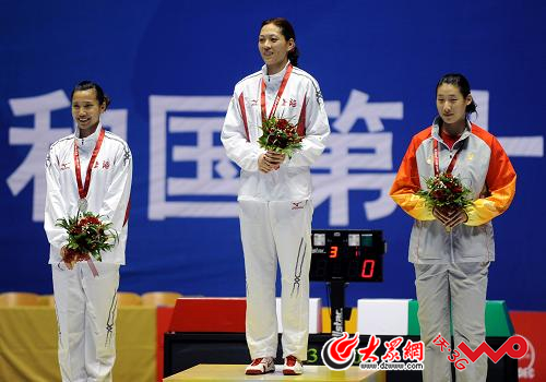 冠軍上海隊(duì)選手沈巍巍(中)、亞軍上海隊(duì)選手仲維萍(左)和季軍遼寧隊(duì)選手孫玉潔在領(lǐng)獎(jiǎng)臺(tái)上。