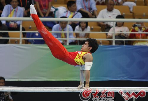 第三個上場的是天津隊王冠寅,在資格賽中就有不俗發(fā)揮的王冠寅,今下午仍然保持良好 狀態(tài),以7.0的起評分拿下15.475分。接下來上場的是廣東的周施雄,在動作進行過半時 ,周施雄失誤落下器械,并在最后的落地時出現不穩(wěn),僅得到13.950分。
