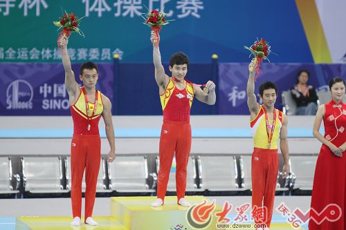 大眾網-山東聯(lián)通3G聯(lián)合報道(記者 明清 新婷 爾印 隋喬 洪棟)十一運體操比賽男女單項的比賽正在進行。男子雙杠決賽剛剛戰(zhàn)罷,馮喆豪奪金牌,加冕冠軍,王冠寅摘得銀牌 ,獲得第三名的是全能王滕海濱。