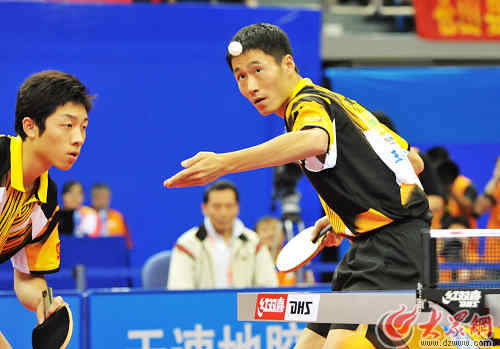 大眾網-聯通3G青島10月1日訊 (記者 吳哲 新婷 洪棟 攝影 湯臻)今晚,中華人民共和國第十一屆運動會乒乓球男雙決賽在青島國信體育館激情上演。在剛剛結束的比賽中,上海組合王勵勤/許昕迎戰天津隊郝帥/李平,最終王勵勤/許昕苦戰七局以4-3戰勝對手,上海隊如愿衛冕男雙金牌。