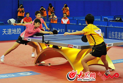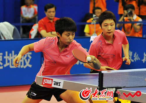 大眾網-聯通3G青島10月2日訊 (記者 吳哲 新婷 洪棟 攝影 湯臻)今晚,全運會乒乓球比賽在青島國信體育館進行最后一天的爭奪。在剛剛結束的女雙決賽中,遼寧的郭躍/侯曉旭以4-1擊敗湖北組合饒靜文/劉娟摘得乒乓球女雙項目的冠軍。