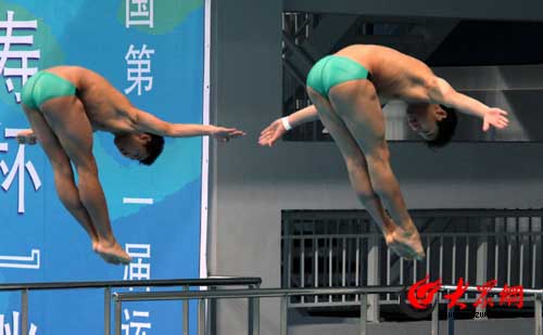 大眾網-聯通3G濟南聯合報道(記者 李冉 馮煒程 燕雨)10月3日上午9點半,全運會跳水比賽在濟南開賽,首日比賽將產生男子團體項目的金牌,團體項目取單人一米板、單雙人三米板、單雙人十米臺5個項目的成績之和,其中上午進行單人一米板、十米臺和雙人三米板,晚上進行單人三米板和雙人十米臺,金牌將在晚上8點左右產生,上午比賽結束后,廣東隊以絕對優勢領先,極有可能奪取跳水首金。
