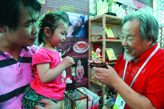 世博會(huì)山東活動(dòng)周非物質(zhì)文化遺產(chǎn)展示區(qū)內(nèi),來(lái)自濟(jì)南的面塑大師何曉錚展示他的面塑藝術(shù)。