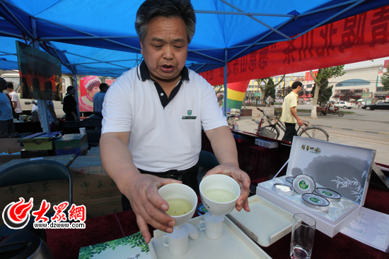 在活動現場一角,濟南市茶業批發市場從事14年之久的品茶師薛德全表演了一番精彩的茶藝!鞍驯P——沖泡——看、聞、品、捏”,一系列工序下來之后,讓市民們見識到了怎樣鑒別好茶!氨贝ú璨诲e,葉質均勻,湯色黃綠、清澈鮮亮,茶香濃厚,耐沖泡!毖Φ氯珰v數北川茶的優點,對茶質贊不絕口。