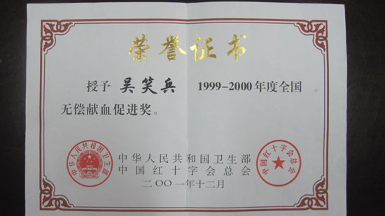 憑著扎實有效的工作和良好的社會反響,他于2002年獲得國家衛生部、國家紅十字會授予的“全國無償獻血促進獎”。
