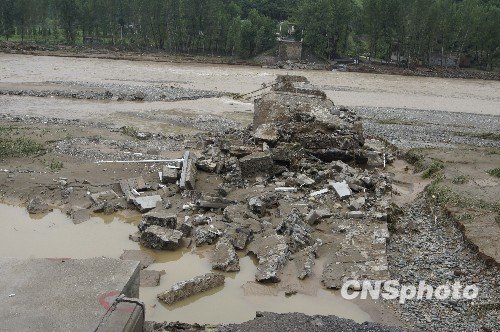 “垮塌時(shí)就像放炮炸山一樣響。”距垮塌大橋百米之外的村民趙斌告訴記者,垮塌時(shí)他聽(tīng)見(jiàn)4聲巨響,而濺起的水花超過(guò)了河兩岸的楊樹(shù),至少有20米高。他認(rèn)為,是由于樹(shù)木阻塞橋孔下泄水面導(dǎo)致的,“洪水太大了,嚇人。”