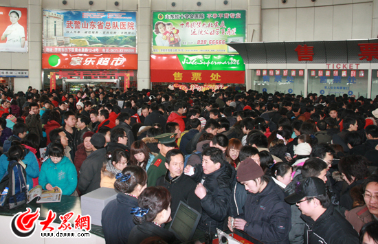 濟南長途汽車站售票大廳內人山人海