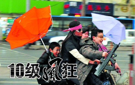 26日下午4時(shí)30分許,濟(jì)南市區(qū)狂風(fēng)大作,最大風(fēng)力達(dá)10級(jí),為省城十年來(lái)最大。圖為一女士騎車(chē)帶著剛放學(xué)的學(xué)生在風(fēng)中艱難行進(jìn)。本報(bào)記者 徐延春 攝