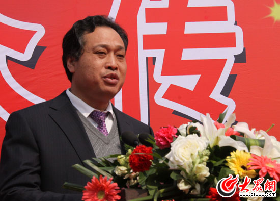3月28日,中建八局二公司董事長韓興爭在大眾傳媒大廈奠基典禮上致詞。大眾網(wǎng)記者曹亮 攝