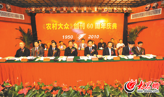 今年5月,《農村大眾》迎來六十華誕。大眾報業集團隆重舉行慶典,慶祝《農村大眾》創刊 60周年。原中共中央政治局委員、國務院副總理、全國人大常委會副委員長姜春云題詞祝賀,勉勵《農村大眾》“立足全局,服務三農”。中共山東省委常委、宣傳部長李群出席慶典并講話。省人大常委會原主任韓喜凱出席慶典。大眾報業集團黨委書記、董事長、總編輯傅紹萬對《農村大眾》提出殷切期望。