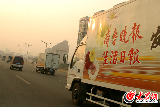 報(bào)紙運(yùn)輸車在晨曦中行進(jìn)