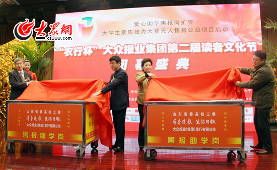 大眾網濟南12月16日訊 (記者 吳哲 盛堃)今天上午,以“感恩、回饋、傳承”為主題的“農行杯”大眾報業集團第二屆讀者文化節在歷時4個多月后閉幕。在長清山東省中醫藥大學舉行的讀者節閉幕盛典上,大眾報業集團發起的“愛心助學售報崗”活動不僅迎來了30個崗位的擴容,大學生素質接力大賽無人售報公益項目也于今日正式在駐濟各高校啟動。