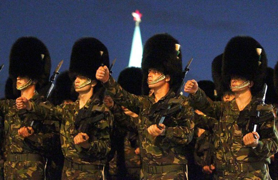 2010年5月4日晚,俄羅斯在紅場舉行閱兵彩排。來自美國、英國、法國和波蘭的盟國軍隊參加了此次預演。圖為參加閱兵彩排的英國威爾士警衛團