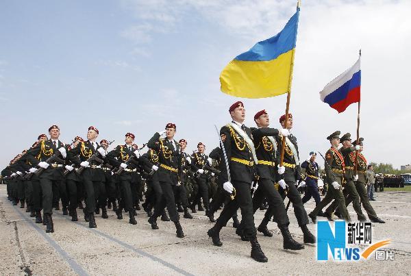 4月30日,在烏克蘭首都基輔,俄羅斯軍人(右)和烏克蘭軍人一同為5月9日第二次世界大戰勝利65周年慶祝游行演練。 新華社/路透