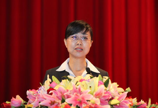 王雪作報告,報告的題目是《用奉獻播撒人間真情》。