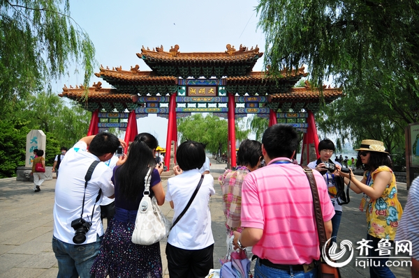 6月20日上午,全國網絡媒體黃河三角洲采訪考察活動采訪團來到大明湖景區采訪報道(記者 張曉博 攝)