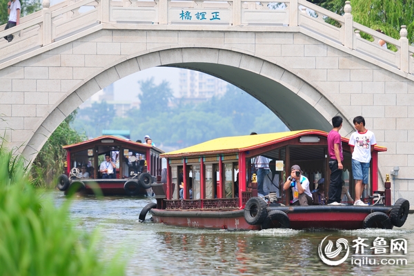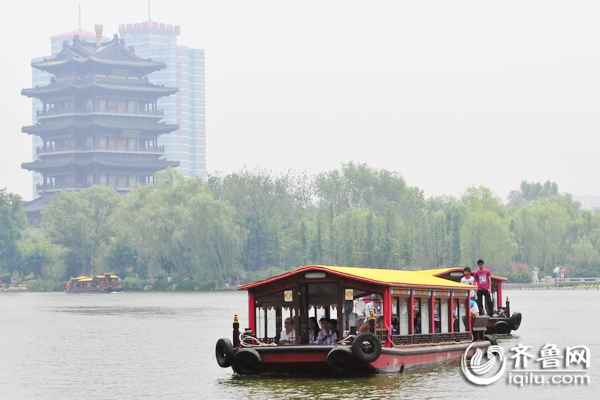 來到大明湖景區(qū),乘船采訪報道