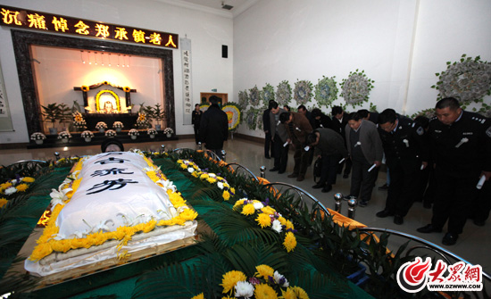 在遺體告別儀式現場,記者看到無論是青年大學生,還是鄭承鎮老人的街坊鄰居、到場的政府領導及年逾古稀的老人,都滿含熱淚、神情悲痛地在鄭承鎮老人遺體前鞠躬再鞠躬,甚至有好多與鄭承鎮素昧平生的泉城市民也被其事跡所感動,送來花圈以表哀悼和敬佩。