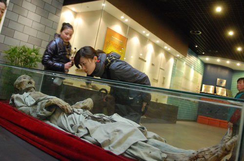 網媒記者與千年干尸親密接觸,一睹其廬山真面目。(大江網記者姚海南攝)