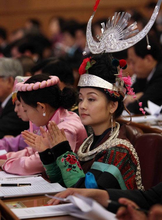 3月5日,第十一屆全國人民代表大會第三次會議在北京人民大會堂開幕。全國人大代表雷阿幼朵在聽會時(shí)鼓掌。