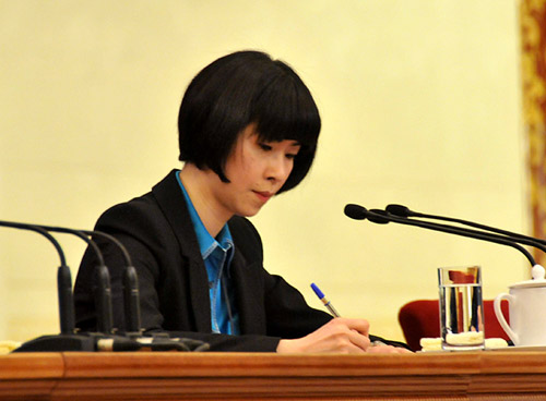 3月14日10時,溫家寶總理在人民大會堂三樓金色大廳與中外記者見面并答問。圖為記者會翻譯正在工作。翟子赫 攝