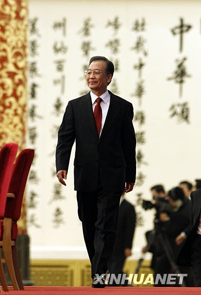 3月14日,國務院總理溫家寶在北京人民大會堂與中外記者見面,并回答記者提問。這是溫家寶總理步入金色大廳。 新華社記者劉建生攝