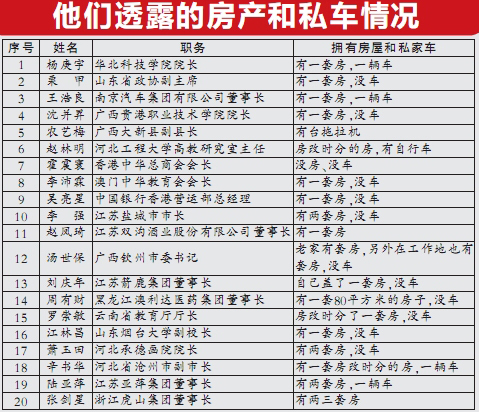 江蘇鹽城市市長李強介紹自己有兩套房。廣西欽州市委書記湯世保說:“我在老家有一套房子,在目前的工作地有一套房子!
