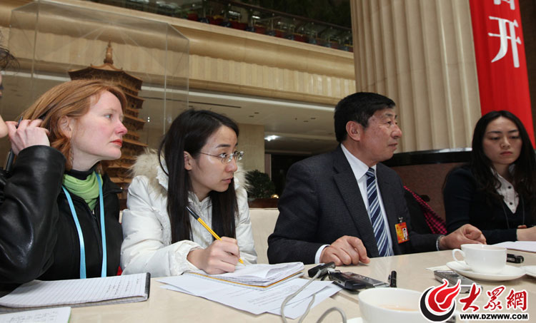 外國美女記者采兩會。3月2日,在山東、安徽、遼寧、福建代表團駐地,一名路透社記者與國內記者一起采訪人大代表。大眾網特派記者 曹亮 攝影報道