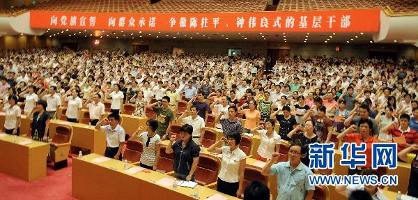 6月30日,參會人員面向黨旗莊嚴宣誓。當日,浙江杭州召開全市“公推直選”社區黨組織書記任職承諾大會,全體新任社區書記以向黨旗莊嚴宣誓、向群眾莊嚴承諾的方式,慶祝黨的89歲生日。據介紹,今年是杭州社區換屆之年,全市589個社區黨組織換屆選舉,有515個社區采取了“公推直選”的方式進行。新華社記者韓傳號攝