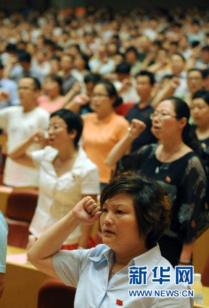 6月30日,參會人員面向黨旗莊嚴宣誓。新華社記者韓傳號攝