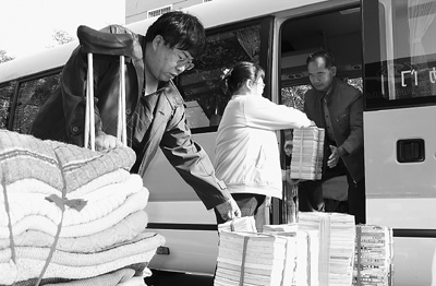 2009年12月,河北任丘華北油田礦區殘疾人王泉去世,他用捐獻遺體的方式,走完人生的最后一程。這個為殘疾人公益事業勞碌奔波多年的人,被大家稱為“公益行者”。(上圖:拄著拐杖的王泉前往淶源張華希望小學,為孩子們捐贈圖書等。資料照片)