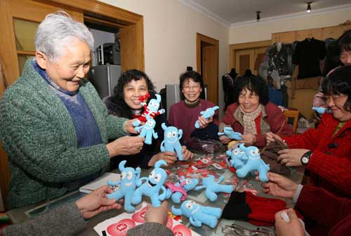 王逢老人(左一)和老姐妹們展示她們為孤殘兒童編織的“海寶”。新華社記者 劉穎 攝