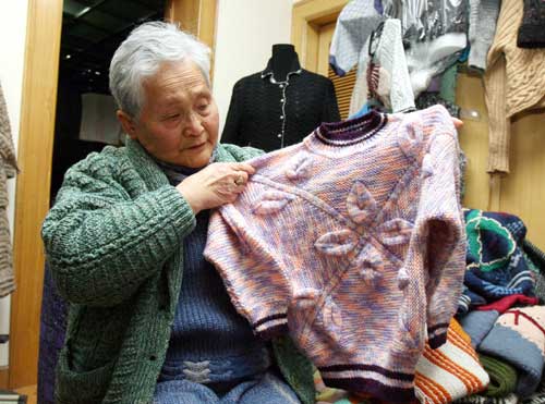 王逢老人展示她為孤殘兒童編織的毛衣。她編織的毛衣不僅保暖,而且圖案和針法都十分講究。新華社記者 劉穎 攝