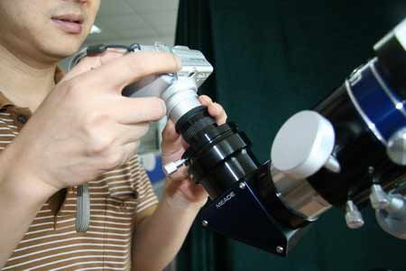 2)、直焦法相對來說麻煩一些。要用這種方法必須使用數碼單反相機,這種相機的鏡頭可以拆卸,將其拆掉后,再把望遠鏡的目鏡拿掉,然后將數碼單反的機身和望遠鏡的主鏡通過轉接環接到一起,這就相當于用望遠鏡直接當相機的鏡頭。這種方法的好處是經過的光學系統最少最簡單,因此能保證質量最好的成像——雖然這樣得到的圖像不如放大法的大。直焦法最關鍵的裝置就是連接相機和望遠鏡的接環。這種接環在天文器材專營店可以買到,不過要注意相機的品牌,不同品牌的數碼單反其接口型號是不一樣的;也要注意望遠鏡目鏡端口多大,一般而言目前常見的目鏡端接口的大小是1.25英寸,也有一些好點的望遠鏡使用2英寸的大接口,而比較老型號的小望遠鏡其接口可能是1英寸的小接口。
