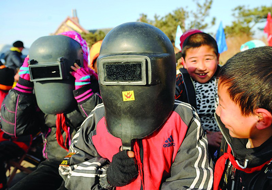 1月15日下午,小朋友在山東青島觀看日環食。(新華社發)