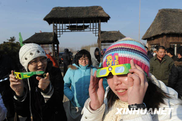 1月15日,兩名女孩在青島西大洋休閑漁村用專用日食觀測眼鏡觀看太陽。新華社記者 李紫恒 攝