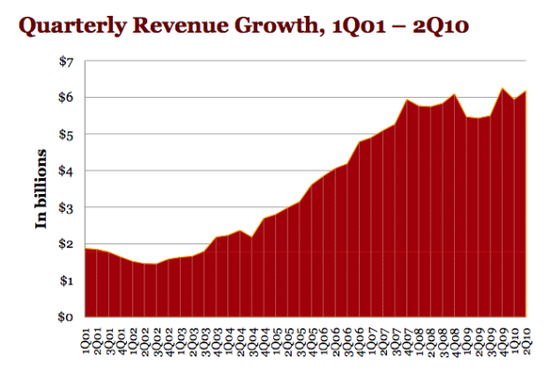 圖為美國(guó)市場(chǎng)2001年一季度到2010年二季度每季度營(yíng)收增長(zhǎng)示意圖