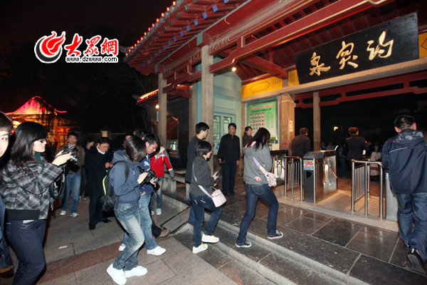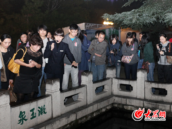 今天晚上8時許,近80名采訪團成員來到了濟南市趵突泉公園,一邊聽著導(dǎo)游的詳細講解,一邊興致勃勃地觀賞“趵突騰空”的迷人美景。“趵突泉真是太美了!”來自大江網(wǎng)的記者吳麗輝一邊用相機定格這一美麗瞬間一邊說,她說自己之前只是在小學(xué)課本上看到過關(guān)于趵突泉的描寫,今天第一次來到濟南,走進趵突泉公園,近距離和泉水接觸,感覺相當不錯。