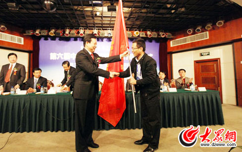 李群向采訪團代表授旗