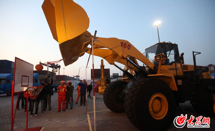 青島港工人技術大比武,上演一個個精彩絕倫的絕活,震撼參觀者。圖為鏟車越障投籃。大眾網記者 曹亮 攝