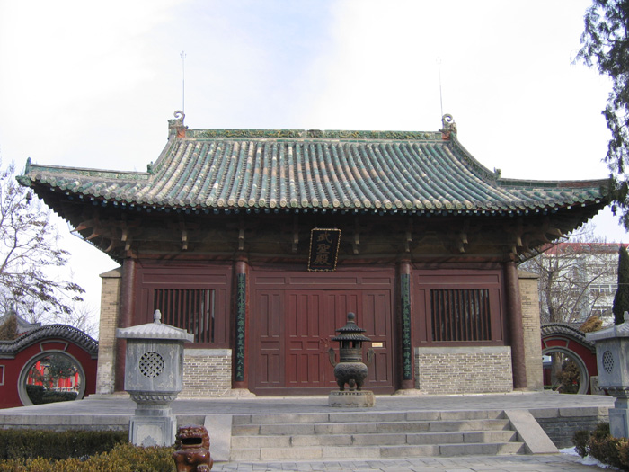 該殿坐北面南,其座月臺(tái)磚石砌筑,寬12.9米,長18.3米,高1.12米。殿面寬3間、12.63米,深三間、10.75米,殿身高10.39米,建筑形式為單檐歇山,綠琉璃瓦頂。這座大殿保持了宋代建筑特有的風(fēng)格,系研究我國中古時(shí)期木構(gòu)建筑的珍貴資料。建國后此大殿維修過兩次,為省級(jí)重點(diǎn)文物保護(hù)單位。