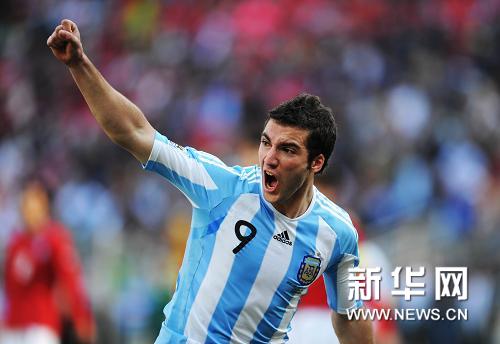 6月17日,阿根廷隊球員貢薩羅·伊瓜因在進球后慶祝。當日,在約翰內斯堡舉行的2010年南非世界杯B組比賽中,阿根廷隊對陣韓國隊。新華社記者王毓國攝