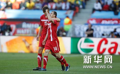 6月18日,塞爾維亞隊球員米蘭·約萬諾維奇(右)在比賽中進球后與隊友尼古拉·日基奇慶祝。當日,在伊麗莎白港進行的2010南非世界杯D組比賽中,德國隊對陣塞爾維亞隊。新華社記者廖宇杰攝