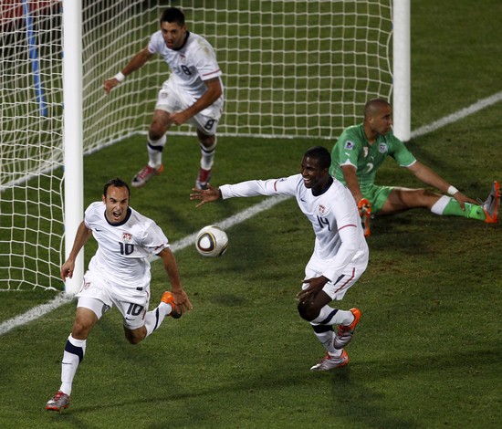 北京時間6月23日22時,南非世界杯小組賽C組第三輪的比賽,在比勒陀利亞的洛夫托斯球場,此前兩戰皆平的美國隊1-0力克北非勁旅阿爾及利亞。由于在同時進行的另一場比賽里,英格蘭1-0擊敗斯洛文尼亞后,英格蘭1勝2平積5分,斯洛文尼亞1勝1平1負積4分。美國隊雖然也積5分,但是憑借進球數優勢獲得小組第一。第19分鐘,鄧普西門前墊射得分,被判越位無效。第36分鐘,阿爾蒂多爾面對空門將球打飛。第56分鐘,鄧普西射門中柱而出,他補射空門居然也不進。第90分鐘,多諾萬補射得分,鎖定勝局。