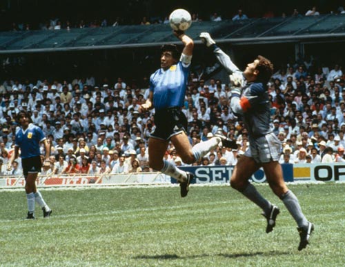 馬拉多納征戰(zhàn)過四屆世界杯,獲得了1986年墨西哥世界杯的冠軍和1990年意大利世界杯的亞軍。而最被球迷們所津津樂道的則是1986年6月22日在墨西哥阿茲臺客體育場阿根廷迎戰(zhàn)英格蘭隊比賽,本場馬拉多納打入的兩球都充滿了戲劇性,其中一個馬拉多納從中場開始帶球,連過5人后將球打入,此球也成為世界杯歷史上最為精彩的進球之一。而另一個進球則充滿了爭議,在一次頭球攻門中,馬拉多納用高舉的手臂將球打進,造就了世界足球史上赫赫有名的“上帝之手”,這個進球也使英阿之間在世界杯上產(chǎn)生了仇恨,并綿延至今。