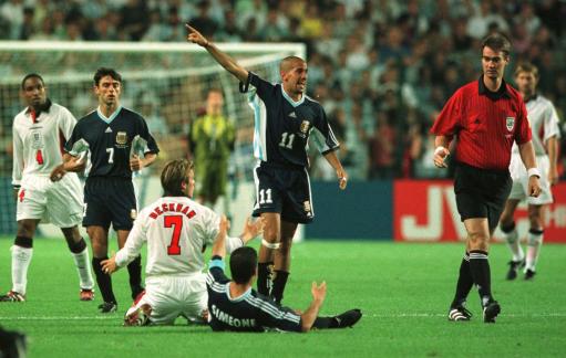 1998年6月30日,法國世界杯提前迎來了巔峰之戰(zhàn),八分之一決賽中阿根廷與英格蘭這對(duì)老冤家再次相遇,比賽進(jìn)行的異常激烈,另外貝克漢姆的紅牌也成為了賽后關(guān)注的焦點(diǎn),雙方在120分鐘內(nèi)打成2-2,點(diǎn)球決勝中阿根廷人以4-3取得了勝利,進(jìn)軍八強(qiáng),圖為貝克漢姆(白衣7號(hào))因受到西蒙尼(倒地者)“挑釁”惡意報(bào)復(fù)吃到紅牌。