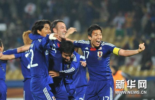 6月24日,日本隊球員慶祝比賽勝利。當日,在勒斯滕堡進行的2010南非世界杯E組比賽中,日本隊以3比1戰勝丹麥隊,以兩勝一負小組第二的成績晉級十六強。新華社記者徐速繪攝